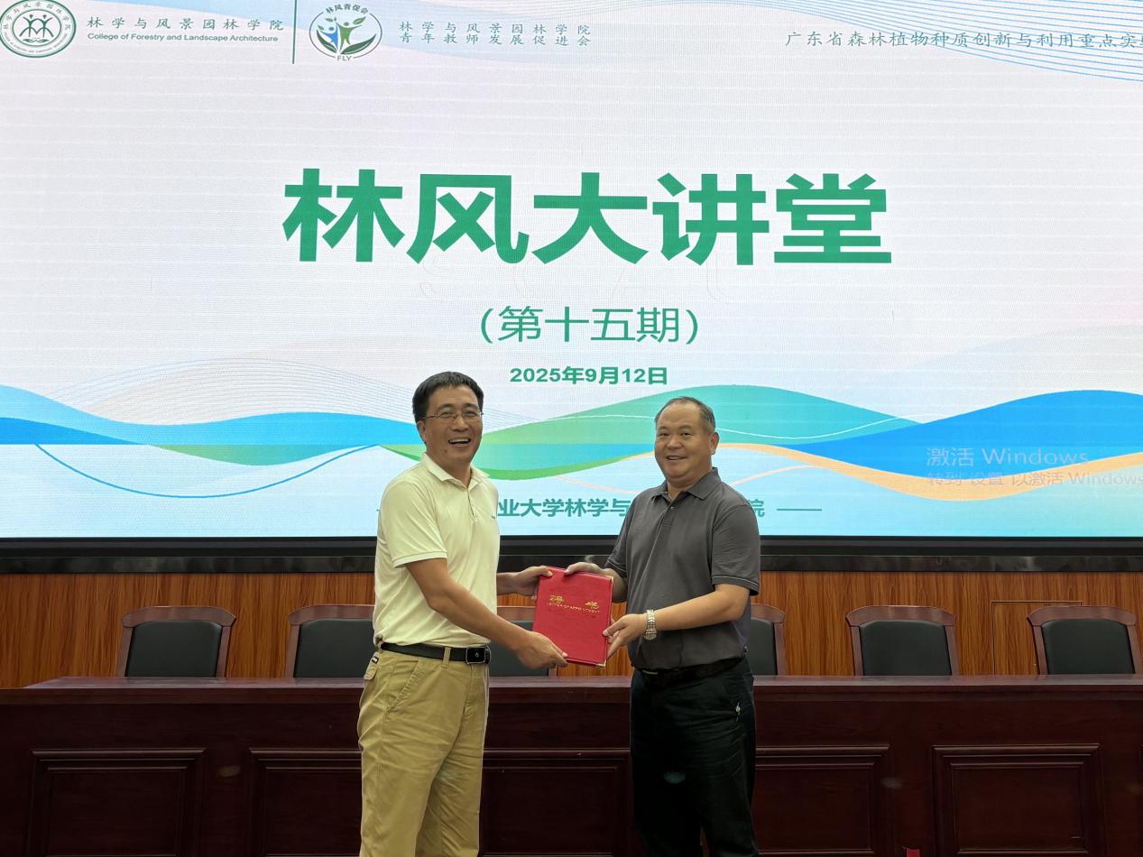 2025年9月12日,第十五期林风大讲堂在林风院楼127室顺利举行。本期讲堂邀请中国林科院速生树木研究所遗传育种研究室主任罗建中博士担任主讲,学院党委书记龙新望出席活动并为罗建中主任颁发“林风大讲堂”专家聘书。