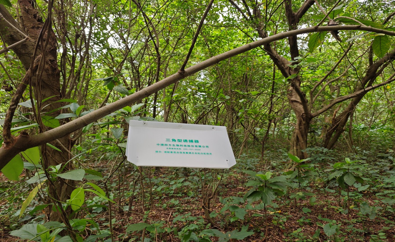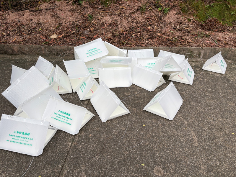 信息素防控技术利用的是昆虫交流的“化学语言”,害虫通过释放性信息素来寻找配偶,人工合成这类信息素后,可在林间干扰其交配行为,从而降低野外种群数量。本项目采用的三角形诱捕器配合特异性信息素引诱剂,可精准诱杀雄虫,减少雌雄交配机会,进而抑制害虫繁殖。该技术具有操作简便、针对性强、成本较低、灵敏度高、无残留、对环境友好等优点,能显著减少农药使用,避免环境污染和抗药性风险。