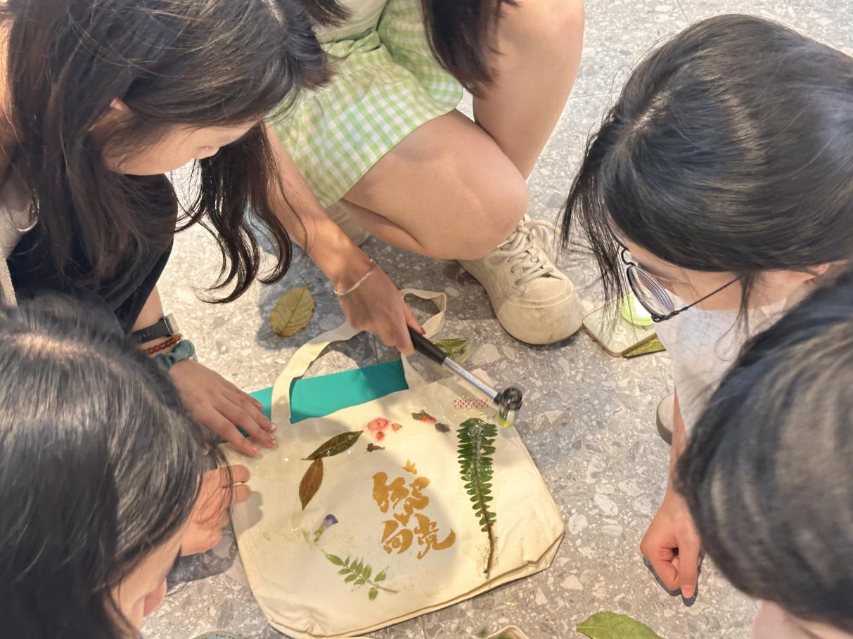 理论学习后,支部结合专业特色,组织党员同志们开展“拓绿痕,印红心”主题当日活动。抽签分组后,党员同志们前往善境花园寻找适合进行拓染的植物。然后回到室内场地,开始了植物拓印制作。