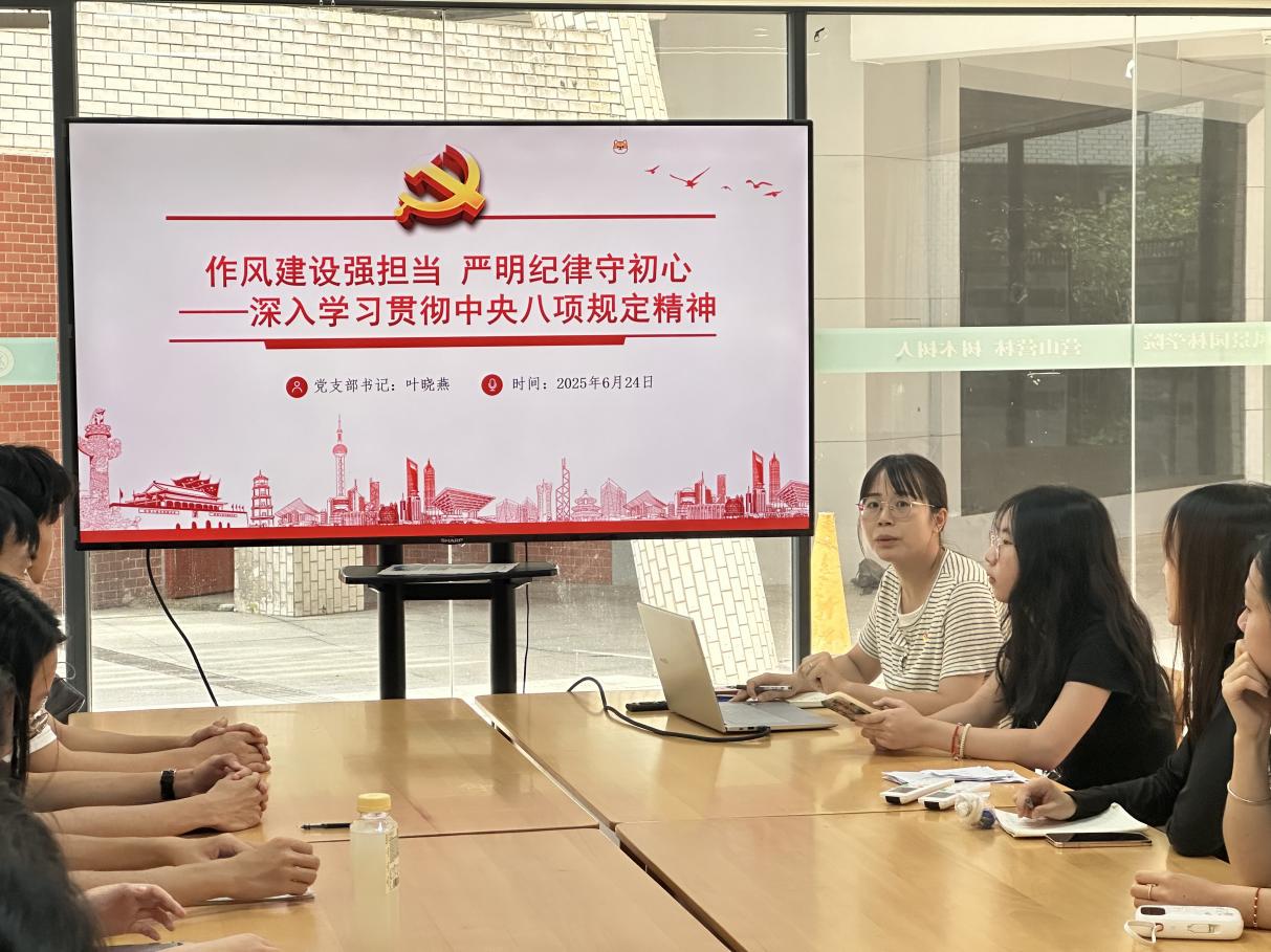 活动伊始,党支部书记叶晓燕老师讲授题为“作风建设强担当 严明纪律守初心——深入学习中央八项规定精神”的专题党课,围绕中央八项规定的出台背景、主要内容及重大意义,结合实际案例进行了深入浅出地讲解,并强调中央八项规定是全面从严治党的重要抓手,党员同志应时刻牢记规定要求,从自身做起,不断提高自身的政治觉悟和纪律意识。