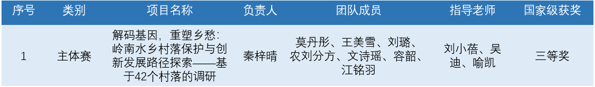 经过层层选拔,共有640件作品进入主体赛的全国终审决赛环节。我院秦梓晴、莫丹彤、王美雪、刘璐、农刘分方、文诗瑶、容韶、江铭羽八位同学在指导老师刘小蓓、吴迪、喻凯的精心指导下全面备赛,最终团队凭借兼具深度与创意的项目成果、沉稳自信的专业表现,荣获主体赛三等奖。