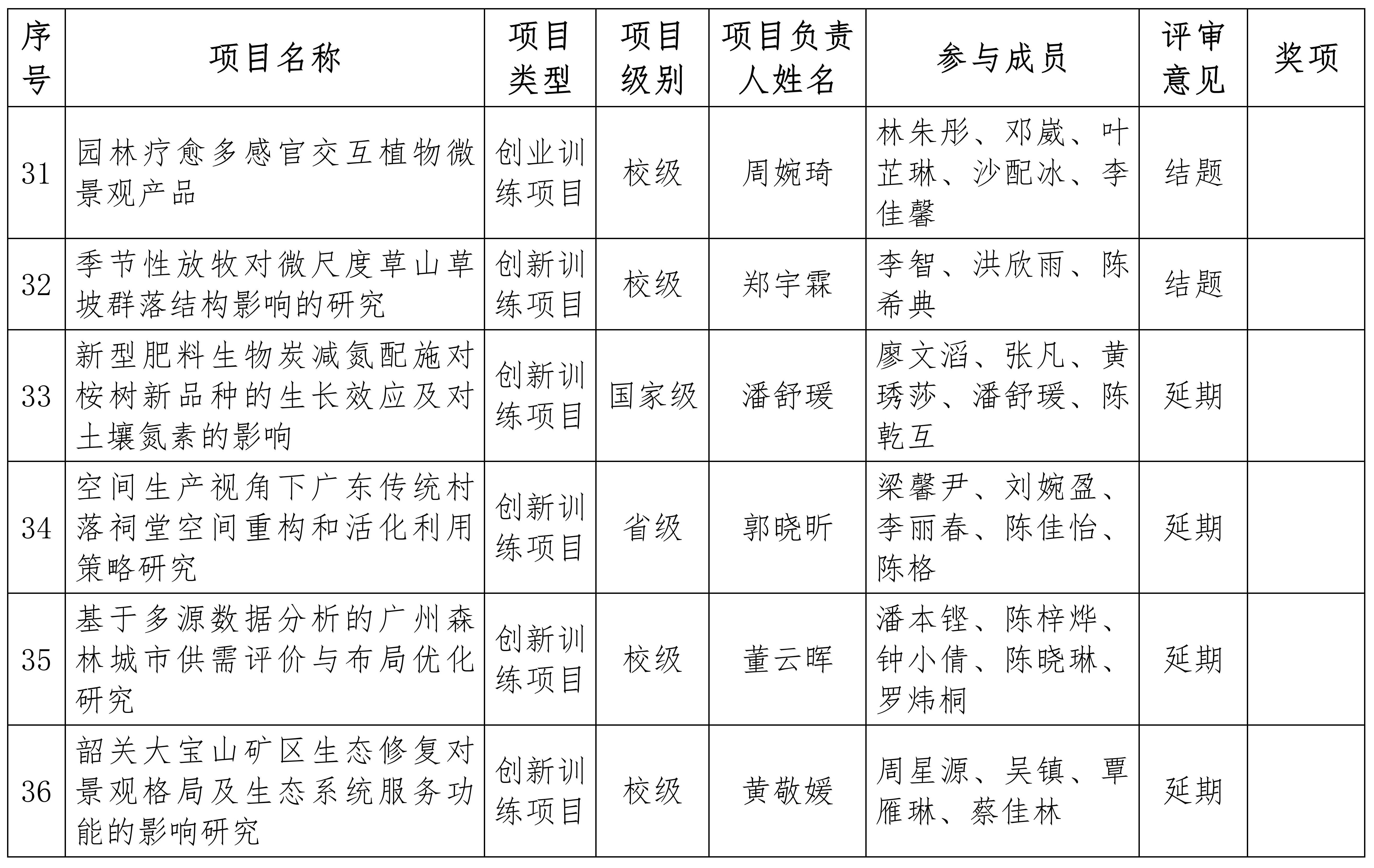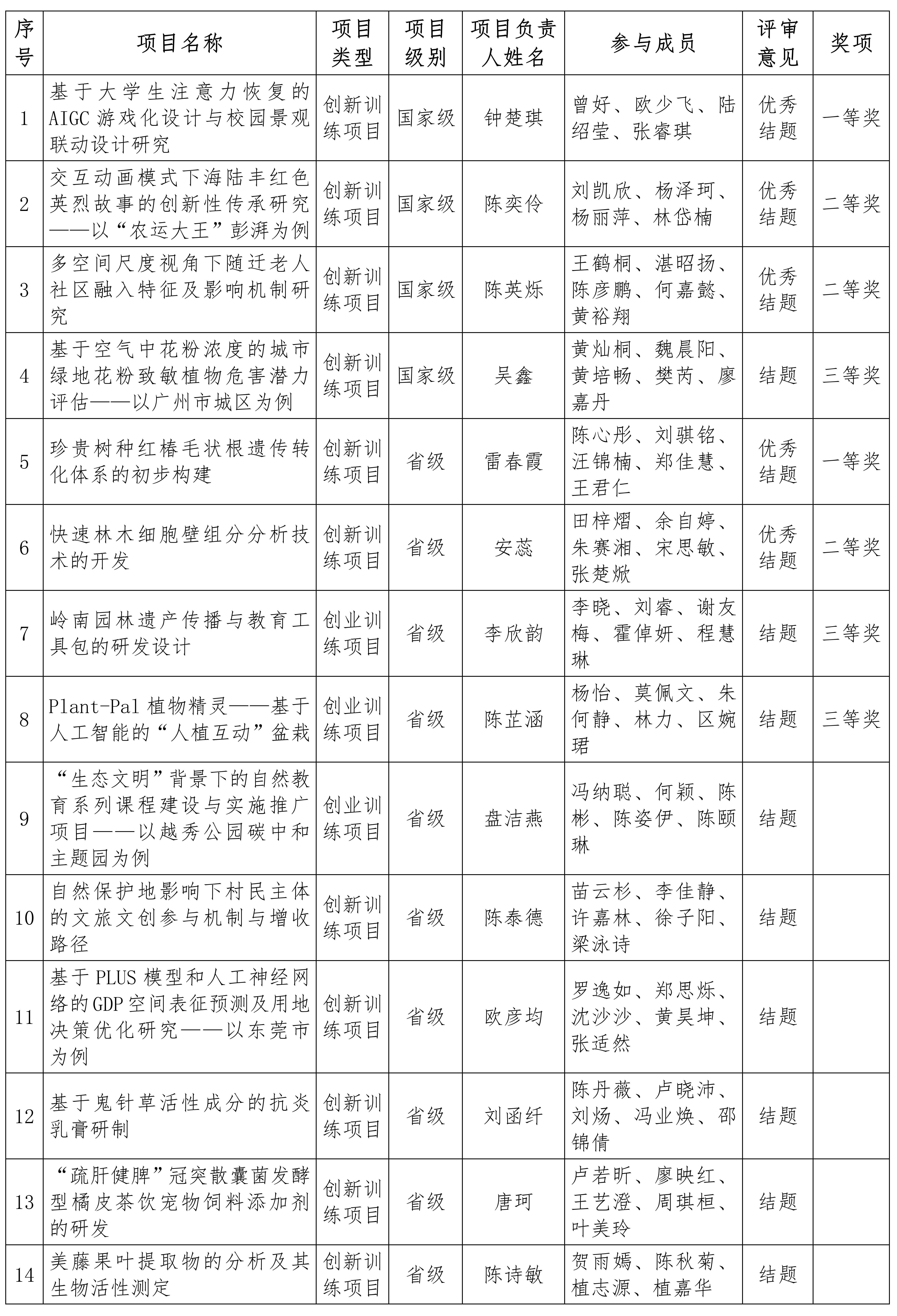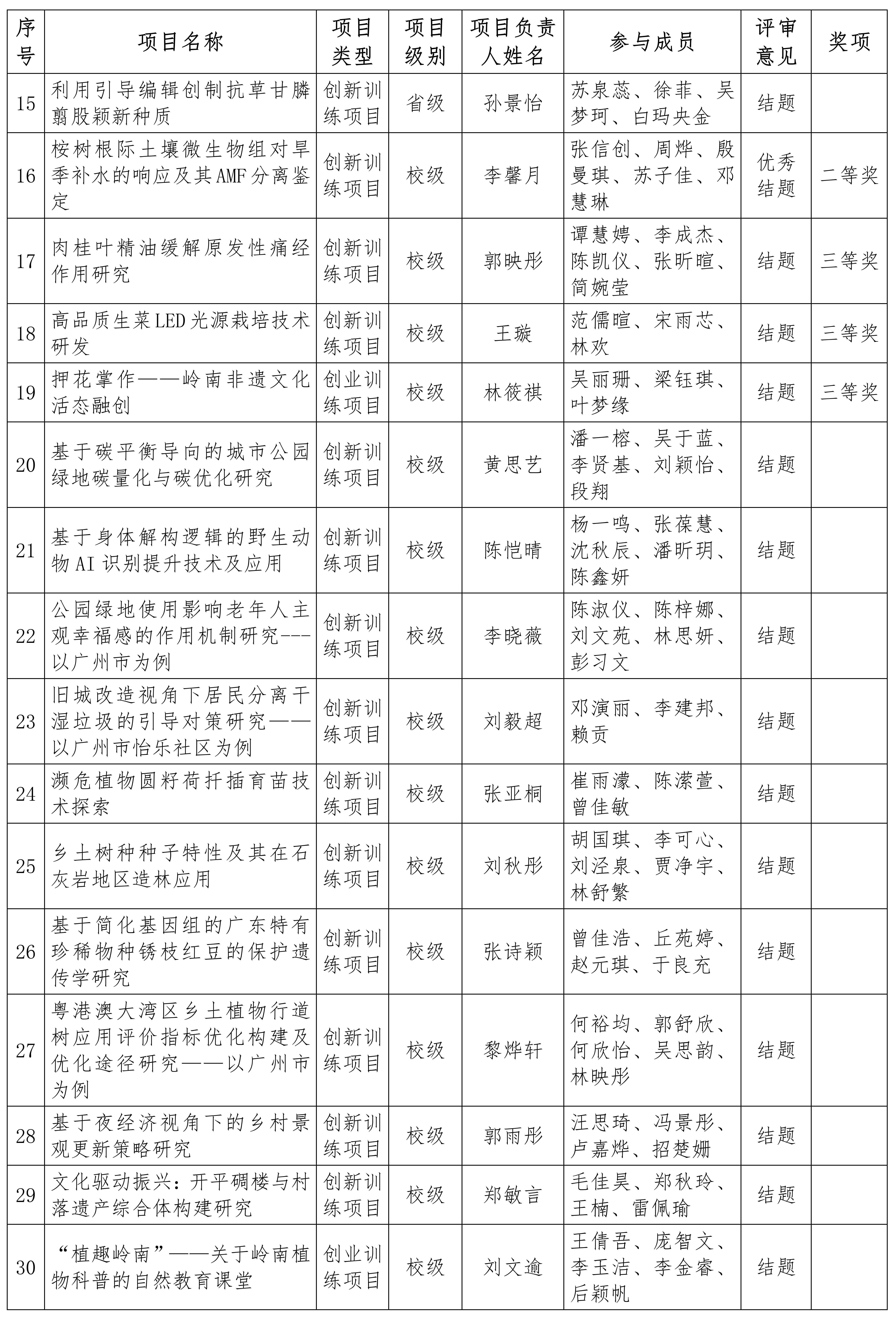 根据《华南农业大学大学生创新创业训练计划管理办法(修订)》(华南农办[2018]119号)的要求,我院组织了第十七届大学生创新创业训练计划项目结题验收答辩会。同时,为表彰在本年度大创项目中表现突出的团队,激励更多学生积极参与创新创业实践、产出优秀成果,学院在结项答辩会上开展了优秀成果项目评选活动。综合各项目的开展情况、成果、答辩表现,经学院专家评审组评审讨论,现将林学与风景园林学院第十七届大学生创新创业训练计划项目结题验收答辩结果以及获奖名单公示如下:
