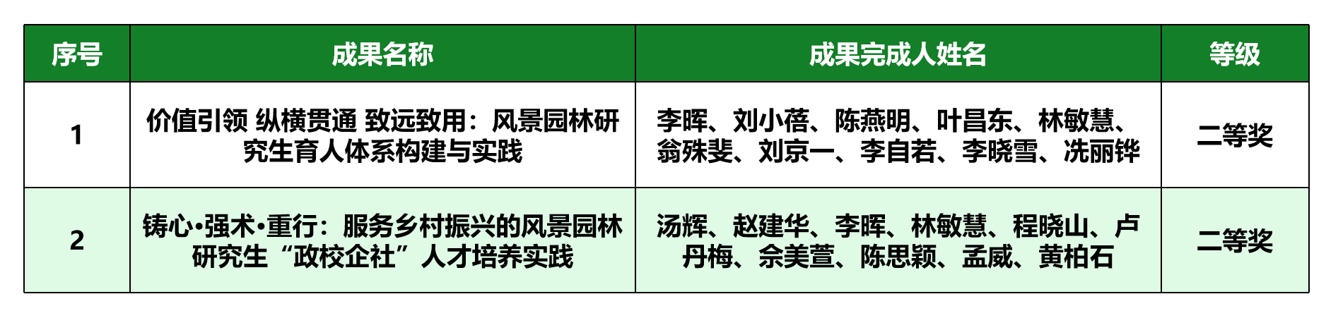 在研究生教育方面,《价值引领纵横贯通致远致用:风景园林研究生育人体系构建与实践》成果,注重价值塑造,贯通本硕博培养,强化学以致用能力;《铸心·强术·重行:服务乡村振兴的风景园林研究生“政校企社”人才培养实践》成果,通过政校企社四方联动,强化研究生理想信念、专业能力和乡村实践。