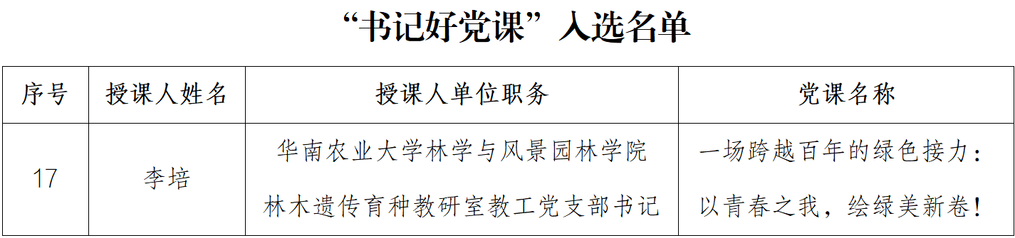 近日,中共广东省委教育工作委员会公布了“党建好案例、书记好党课、党员好榜样”优秀成果入选名单。我院林木遗传育种教研室教工党支部书记李培老师主讲的党课《一场跨越百年的绿色接力:以青春之我,绘绿美新卷!》获评“书记好党课”优秀成果,展现出我院在推动党建育人相融相促方面取得的显著成效。