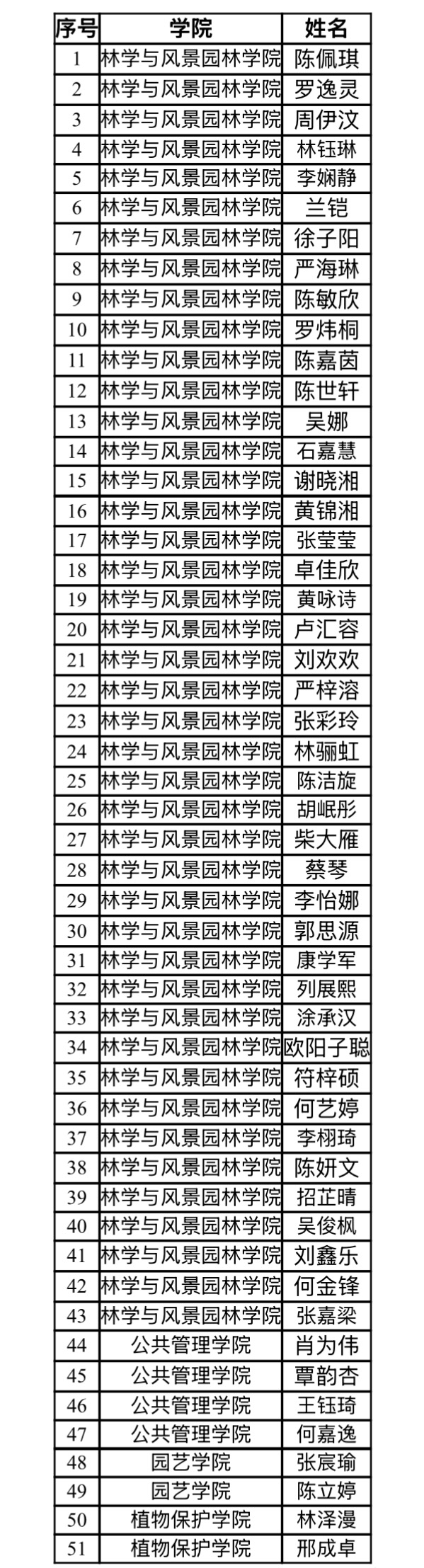 林学与风景园林学院2026年寒假“万名学子乡村大调研行动”立项工作已圆满结束,经由团队及个人提交报名材料、学院审核、校团委复核,共有51名同学报名成功,现将学院立项成功名单公示如下: