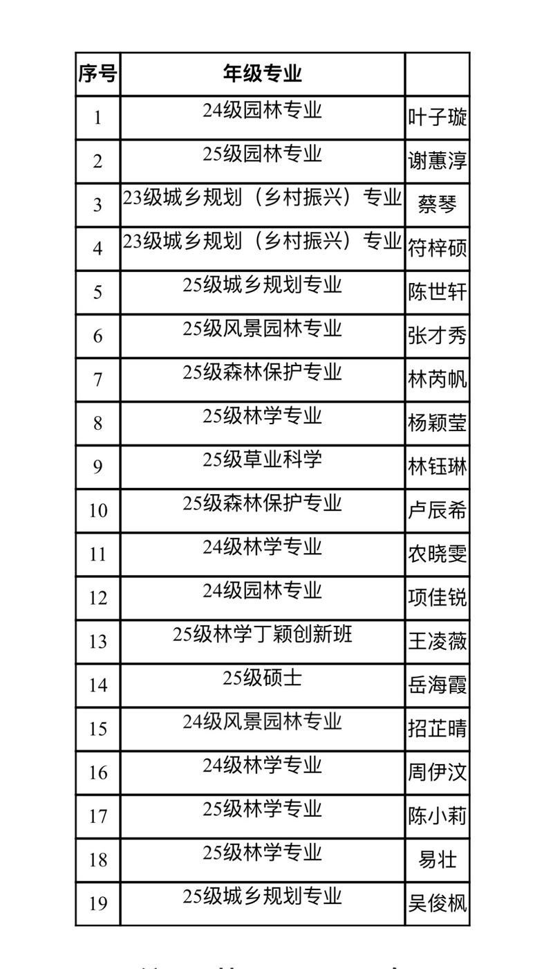 林学与风景园林学院2026年寒假“三下乡·返家乡” 社会实践活动的报名审核工作已圆满结束,经由个人提交报名材料、学院审核、校团委复核,共有19名同学报名成功,现将审核通过名单公示如下:
