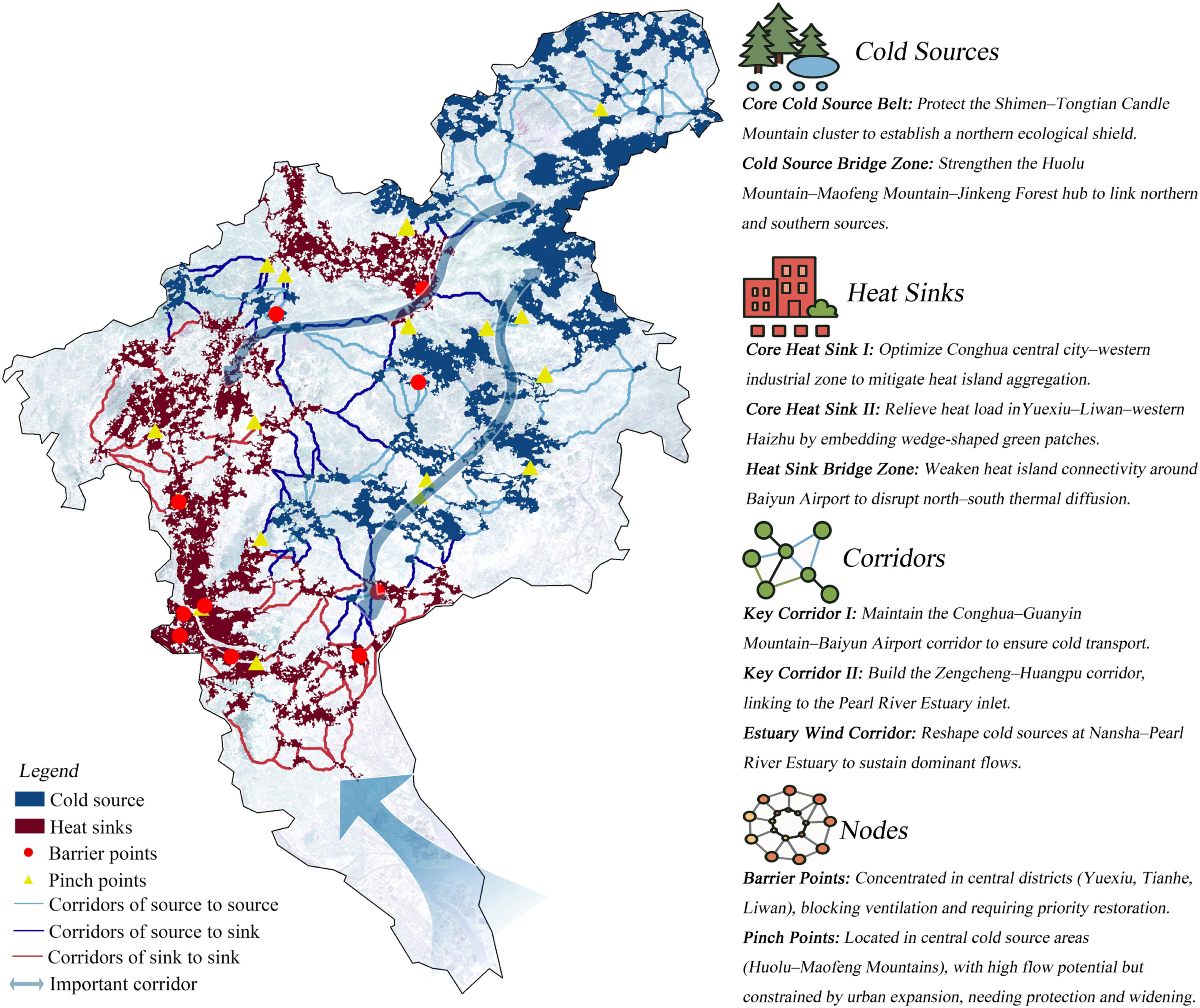 在全球气候变化与快速城市化的双重压力下,高密度超大城市热环境系统日益复杂,热风险加剧且呈现显著的空间异质性。该研究以广州为典型案例,基于多期城市热环境演变数据,从网络化视角系统识别在不同时段和空间情景下对城市通风与热环境调节具有关键作用的核心廊道与节点,揭示通风网络结构、冷源—热汇格局与热环境调控效能之间的时序耦合关系,为城市通风体系的动态评估、优化与管控提供了新的方法路径。