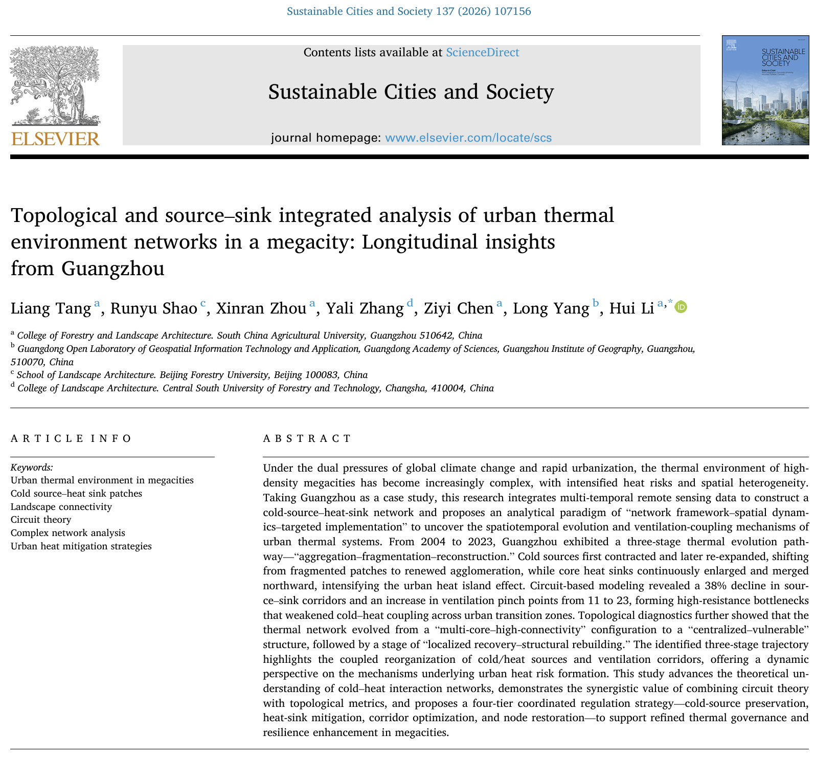 近日,林学与风景园林学院李晖教授团队在国际期刊《Sustainable Cities and Society》(中科院一区TOP期刊,IF=12.0)发表题为“Topological and source–sink integrated analysis of urban thermal environment networks in a megacity: Longitudinal insights from Guangzhou”的研究论文。