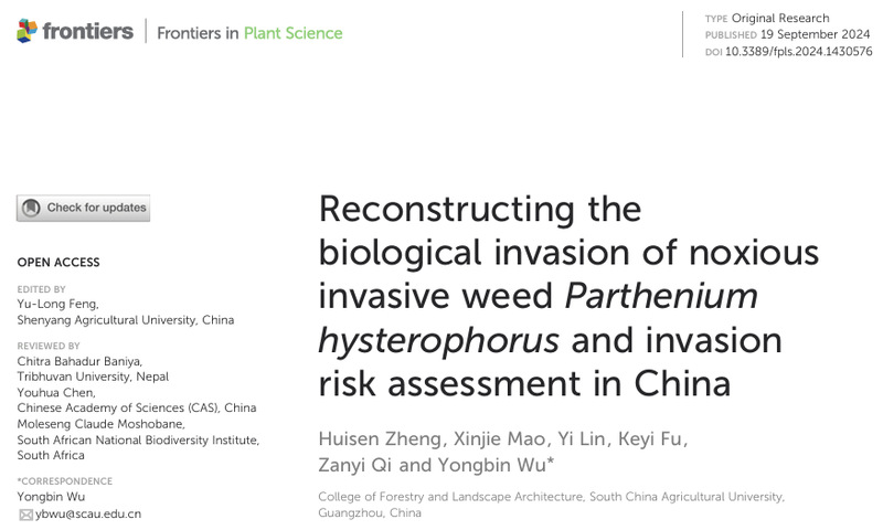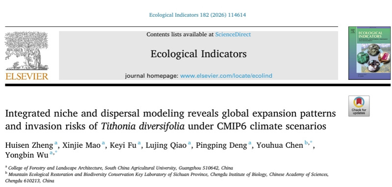 近日,林学与风景园林学院吴永彬教授团队在国际顶级期刊《Ecological Indicators》(中科院一区TOP期刊,IF=7.4)发表学术论文,这是继2024年在《Frontiers in Plant Science》(中科院二区TOP期刊)发表关于外来入侵植物的重要研究成果。这两项研究系统揭示了两大恶性入侵植物——银胶菊(Parthenium hysterophorus)和肿柄菊(Tithonia diversifolia)的入侵历史、扩散机制与未来风险,为全国乃至全球区域尺度的入侵物种早期预警与精准防控提供了重要的科学依据与实践指导。