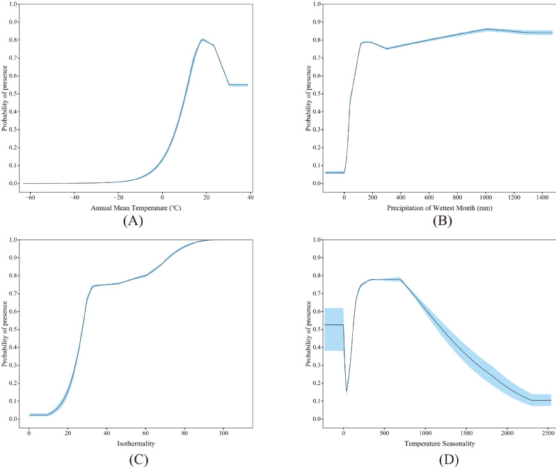 图2 重要环境变量bio1(a), bio13(B), bio3(C), and bio4(D)