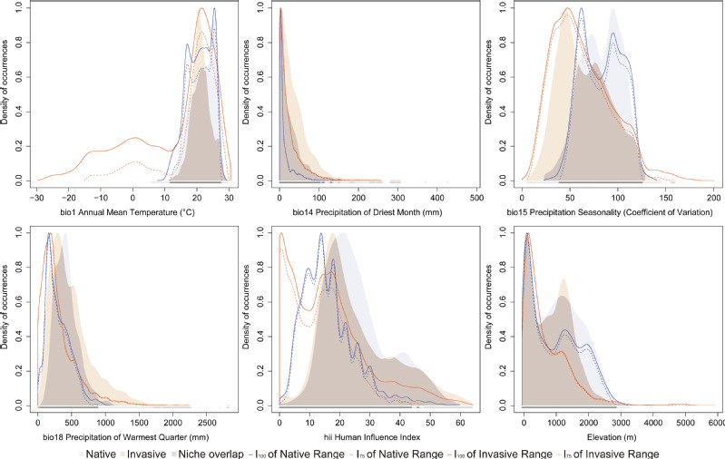 图2 原产地与入侵地环境因子的核密度曲线