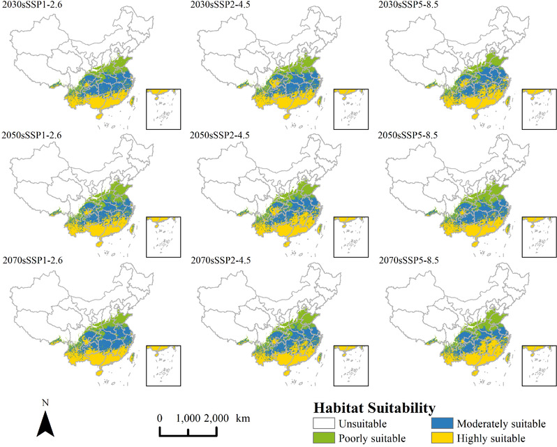 图3 银胶菊在九种不同未来气候条件下的潜在分布