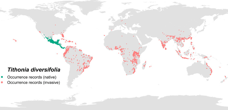 生物入侵已成为全球生物多样性面临的最严峻威胁之一,而气候变化的加剧进一步放大了这一风险。肿柄菊(T. diversifolia)原产于墨西哥及中美洲,因其极强的适应性和扩散能力,现已入侵至全球70多个国家和地区(图1),对当地生态系统、农业生产乃至社会经济造成了严重影响。准确预测其在未来气候条件下的潜在分布和扩散动态,是制定有效防控策略的科学基础。该研究通过整合生态位动态、物种分布模型与扩散模型,首次在全球尺度上评估了肿柄菊在全球气候变化背景下的入侵格局与未来风险,为外来入侵物种的早期预警和精准管理提供了全新的理论框架。