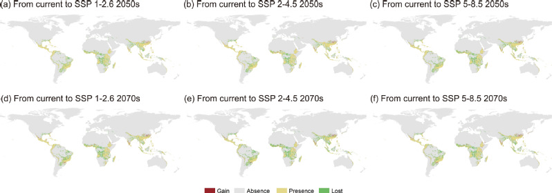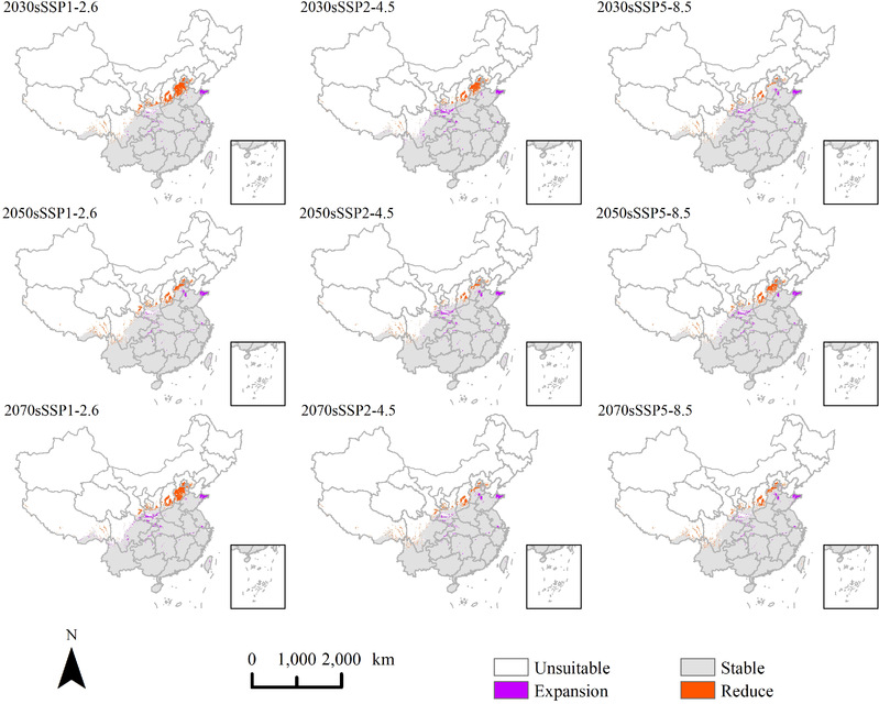 图6 未来气候情景下肿柄菊分布范围的二值变化图