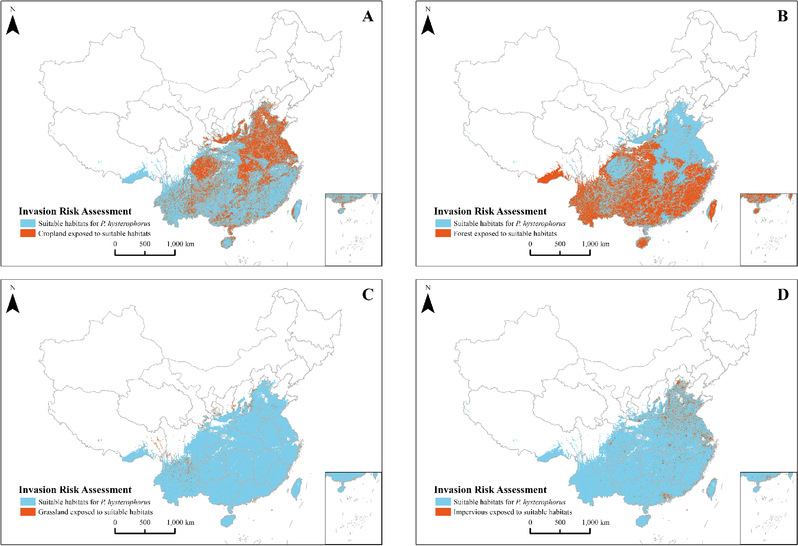 图5 银胶菊入侵风险在农田、森林、草原及城市土地的分布情况