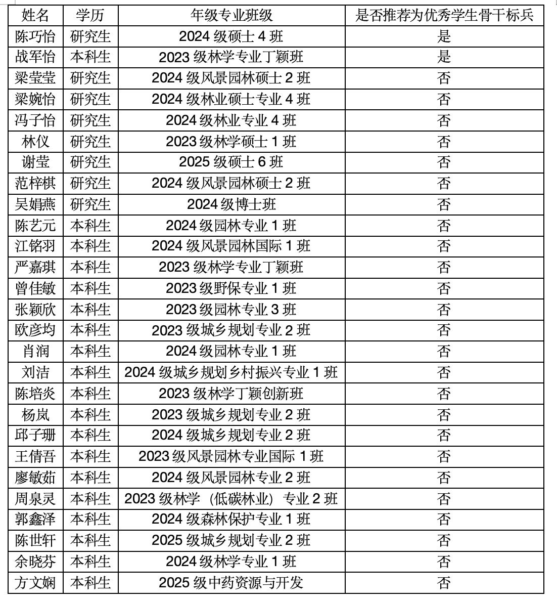 根据学校团委《关于评选表彰2025-2026年度 “华南农业大学红旗学生会(标兵)、红旗研究生会(标兵)”、“华南农业大学优秀学生骨干(标兵)” 的通知》要求,经自主申报、学院团委评审、报学院党委批准,现将2025-2026年度华南农业大学“优秀学生骨干(标兵)”拟推荐名单公示如下: